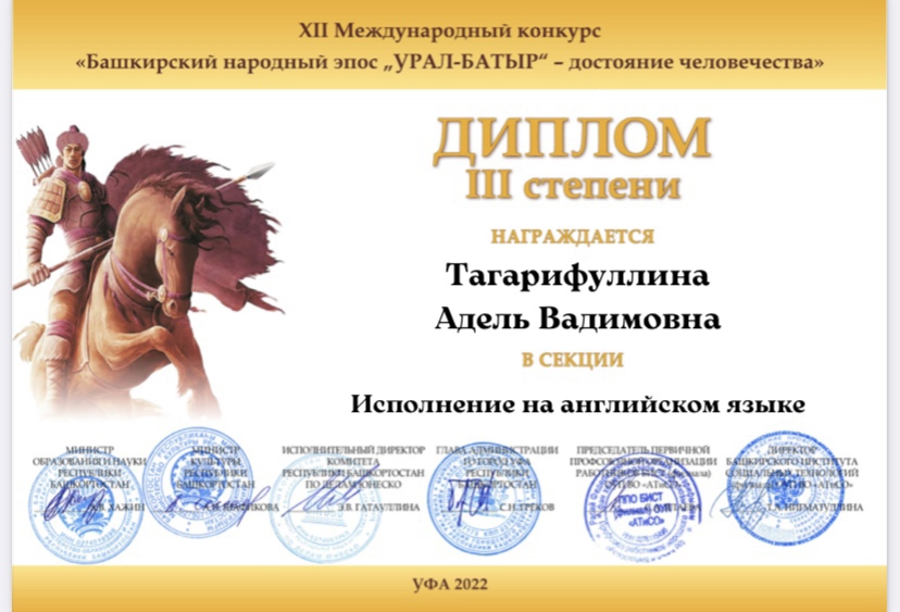 18 февраля 2022 года состоялся XII Международный конкурс «Башкирский народный эпос «Урал-батыр» - достояние человечества" ( БИСТ г.Уфа). Поздравляем дипломанта 3 степени ученицу 9Б класса Тагарифуллину А. и учителя английского языка Васимову Э.Ф.
