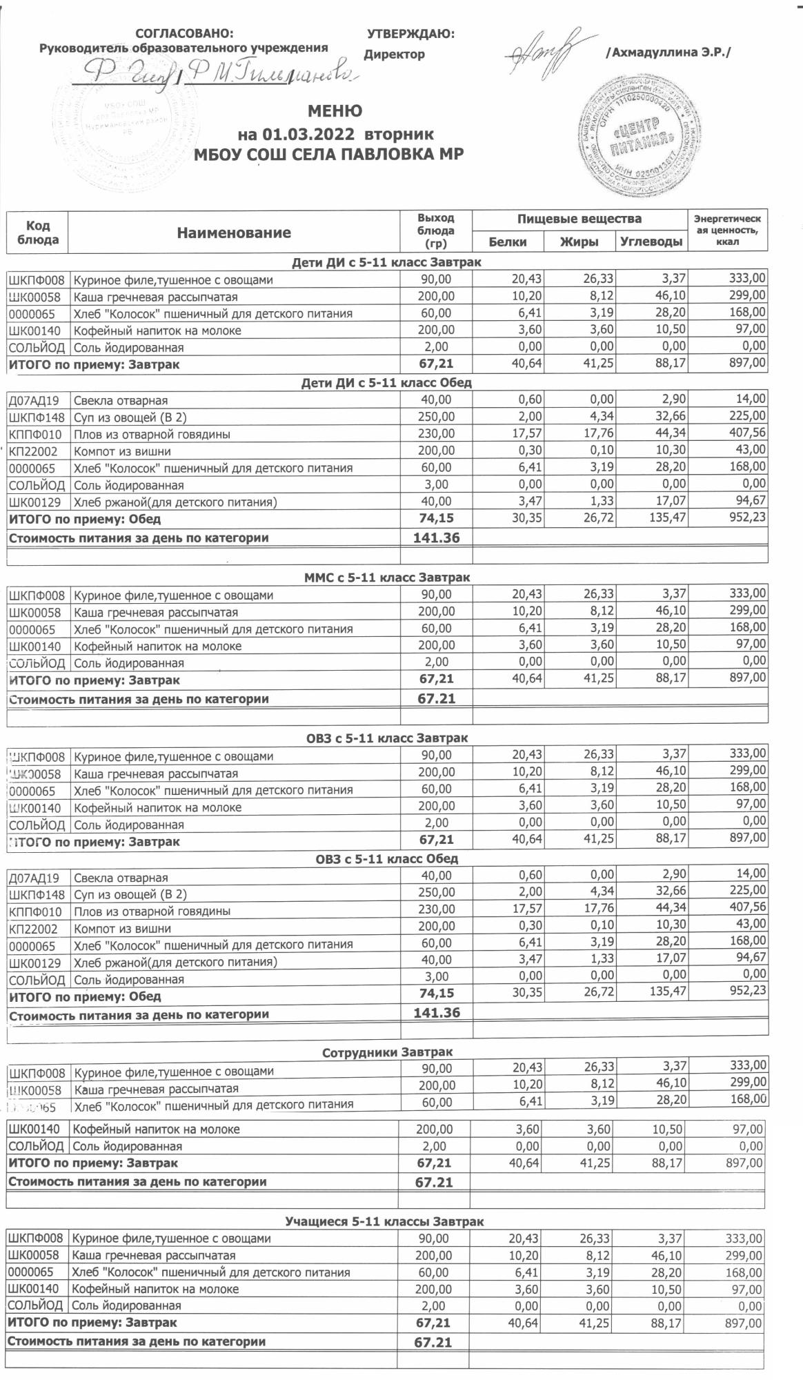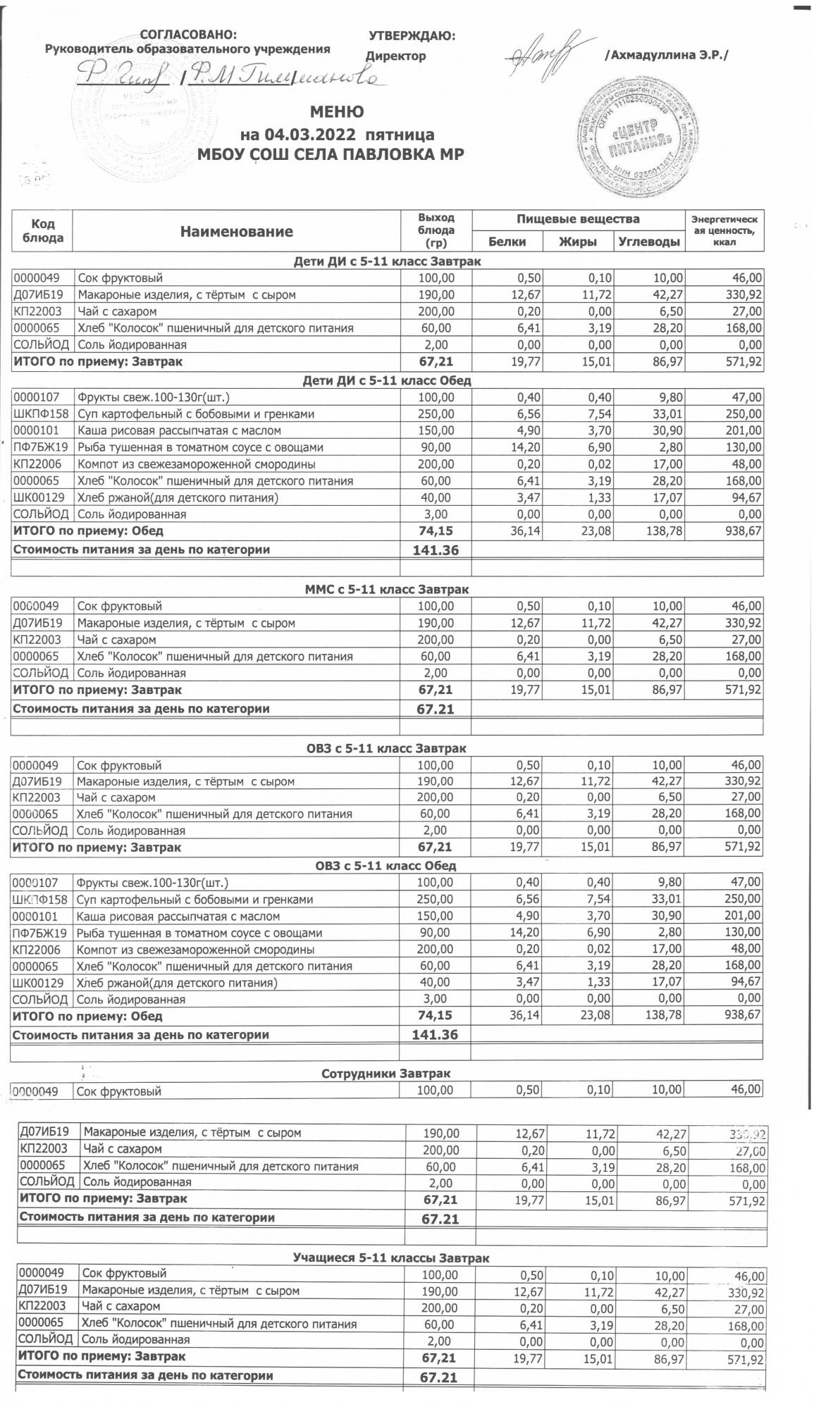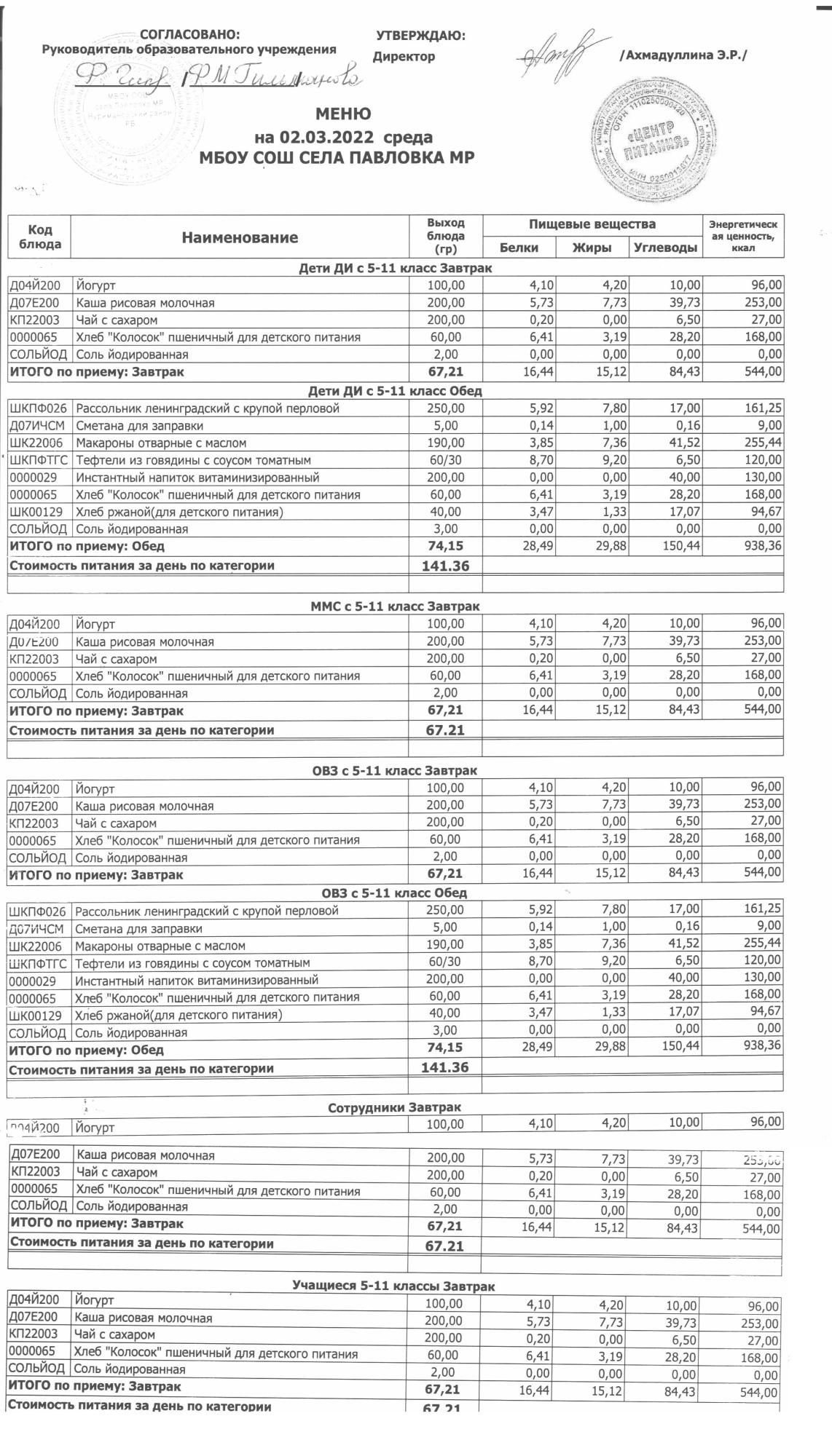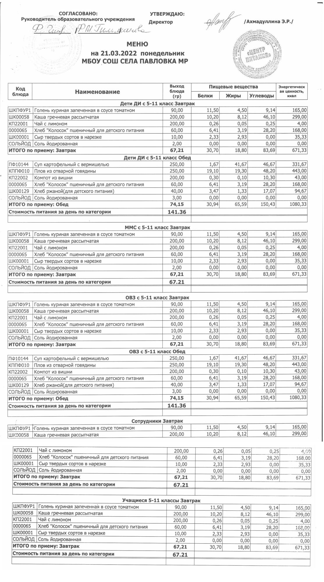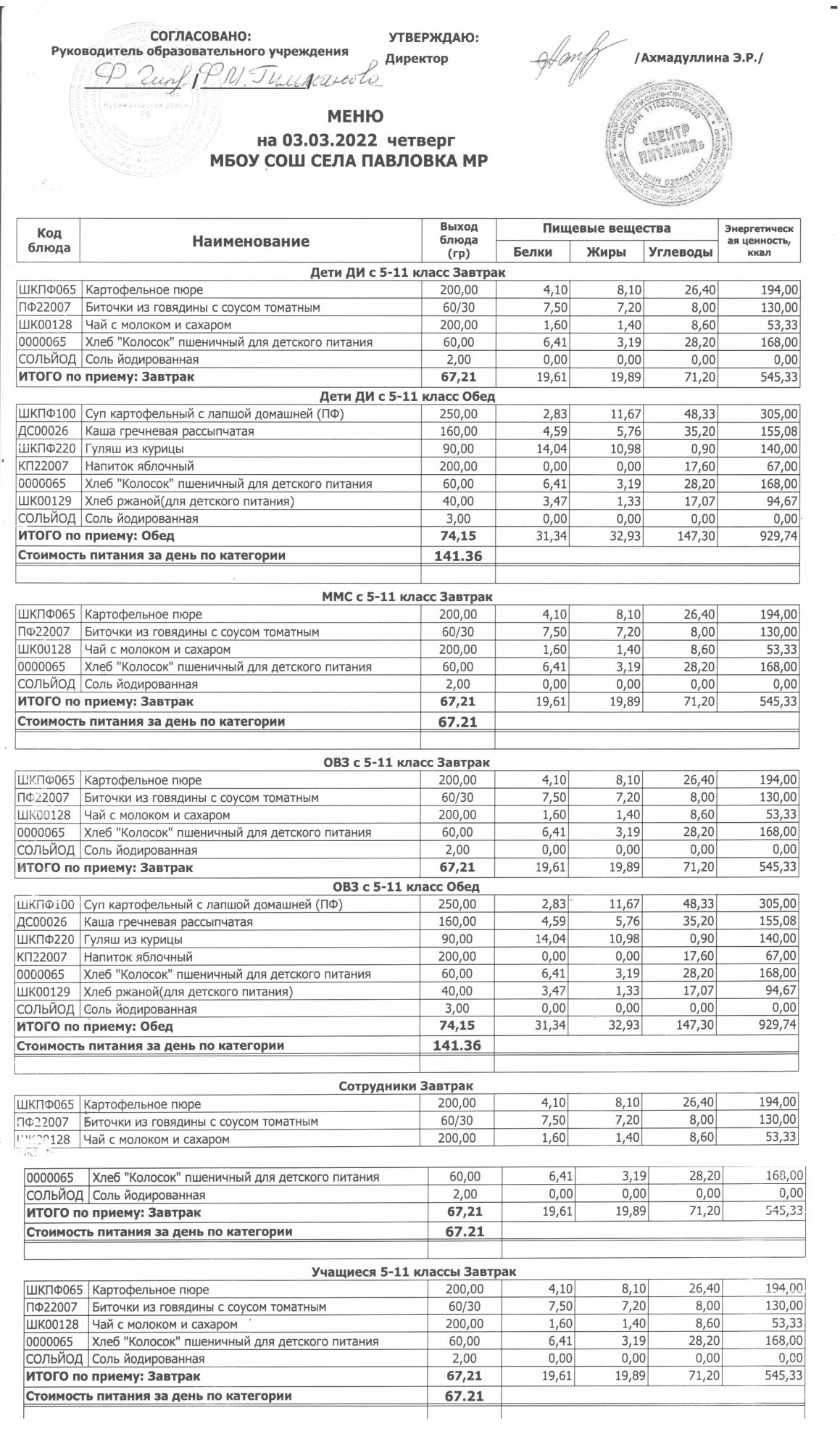 (меню на 14.03.2022г. в основной школе)