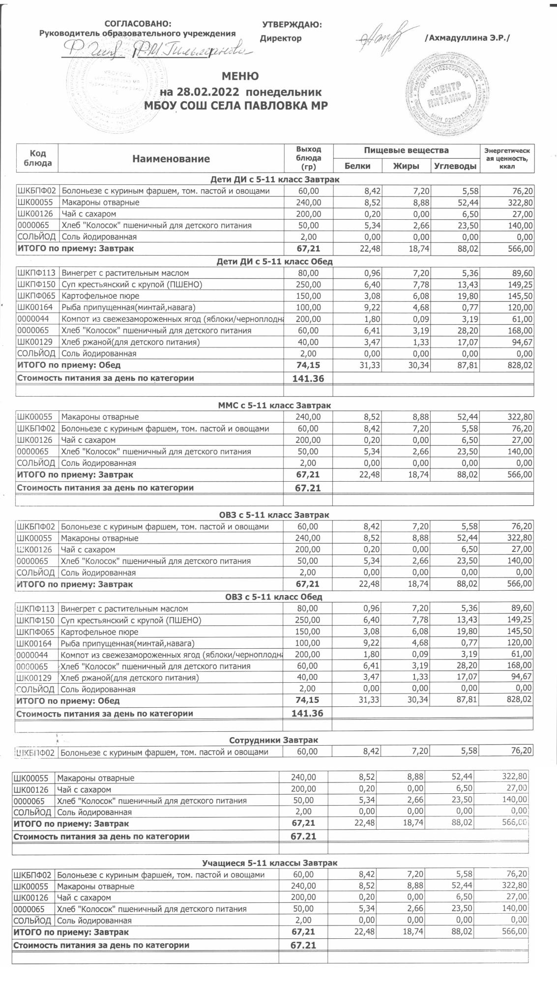 (меню на 28.02.2022 г. в основной школе)