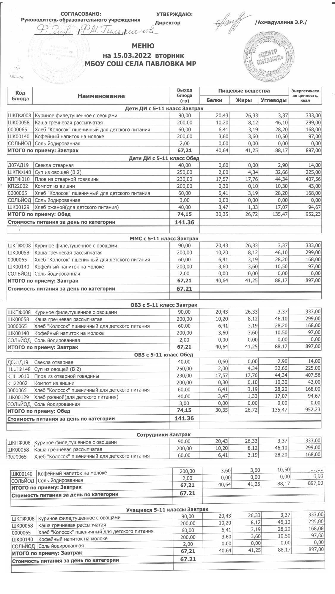 (меню на 15.03.2022г. в основной школе)