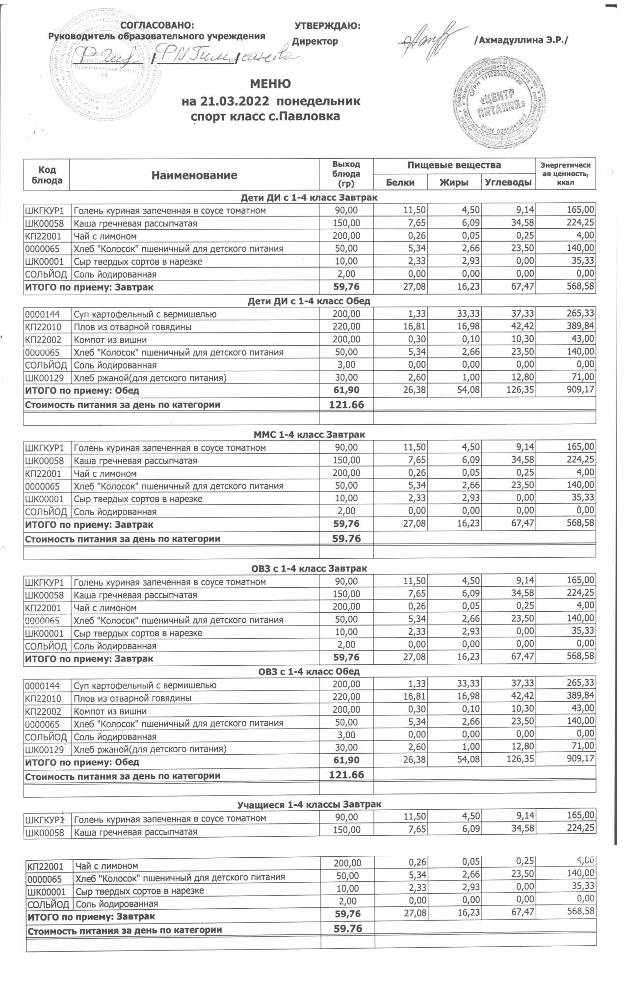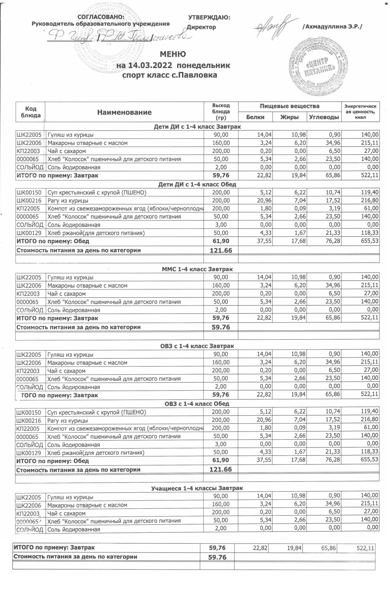 (меню на 14.03.2022г. в начальной школе)