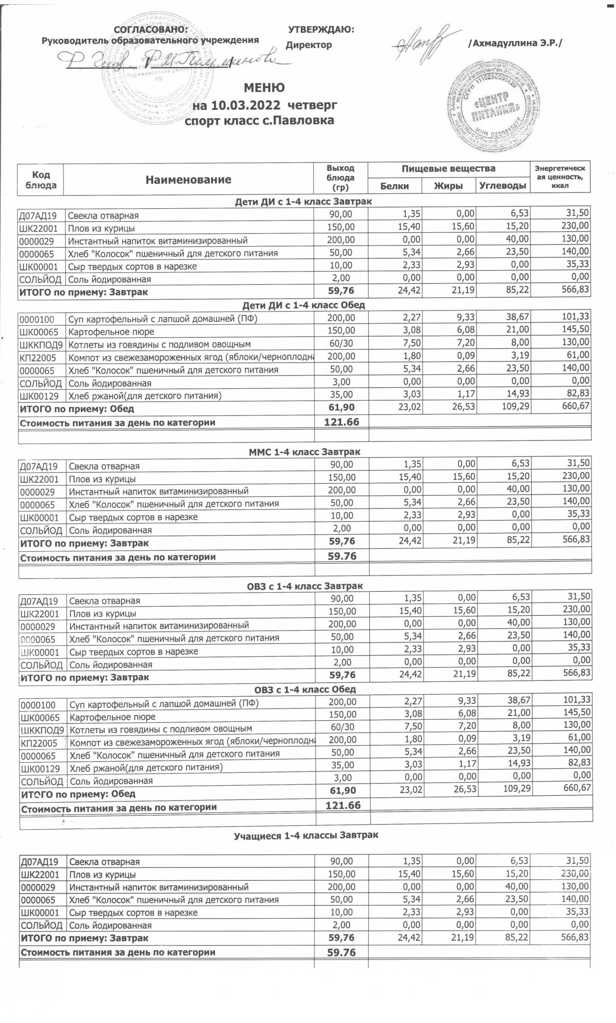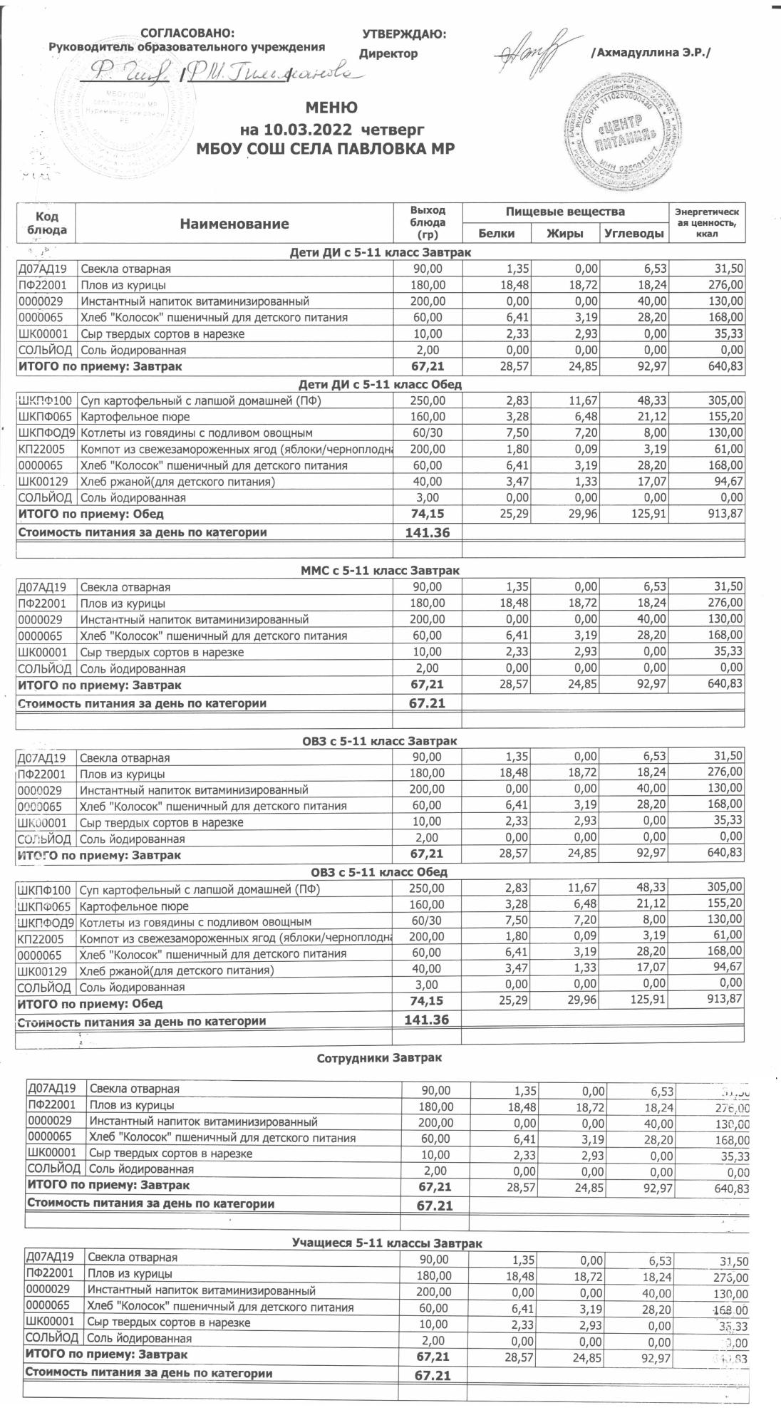 (меню на 10.03.2022г. в основной школе)