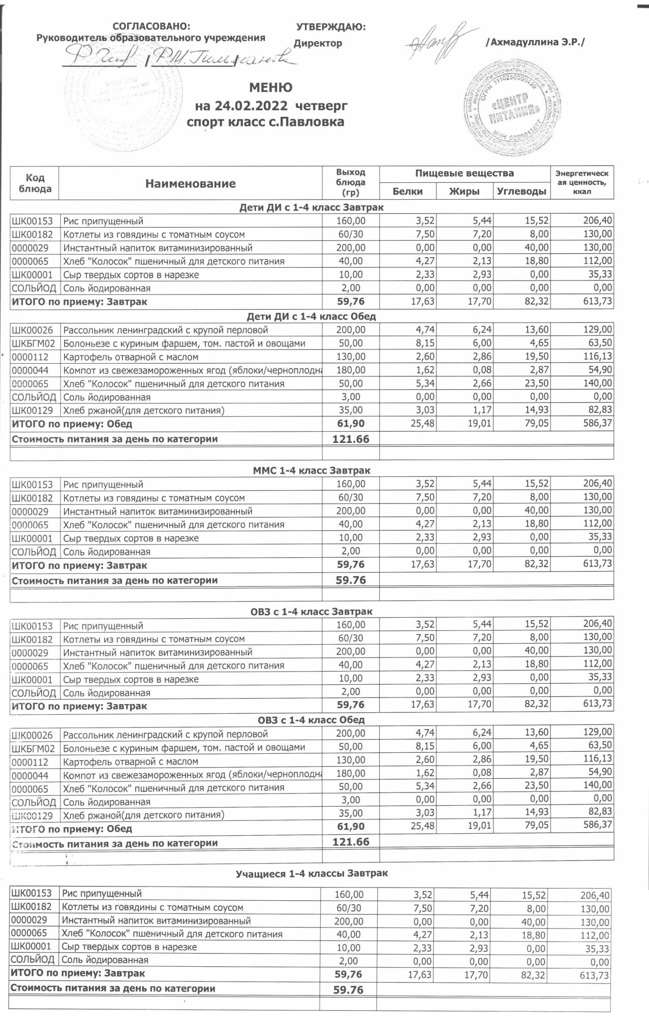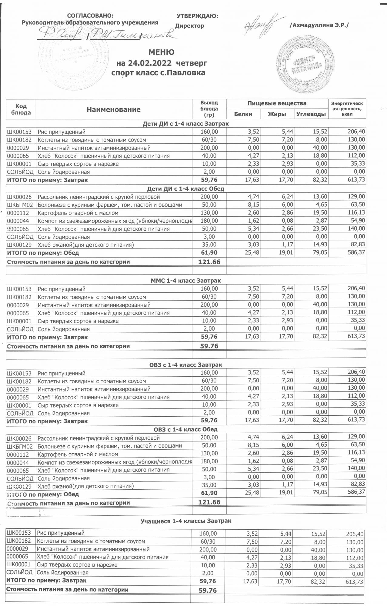 (меню на 24.02.2022 г. в основной школе)