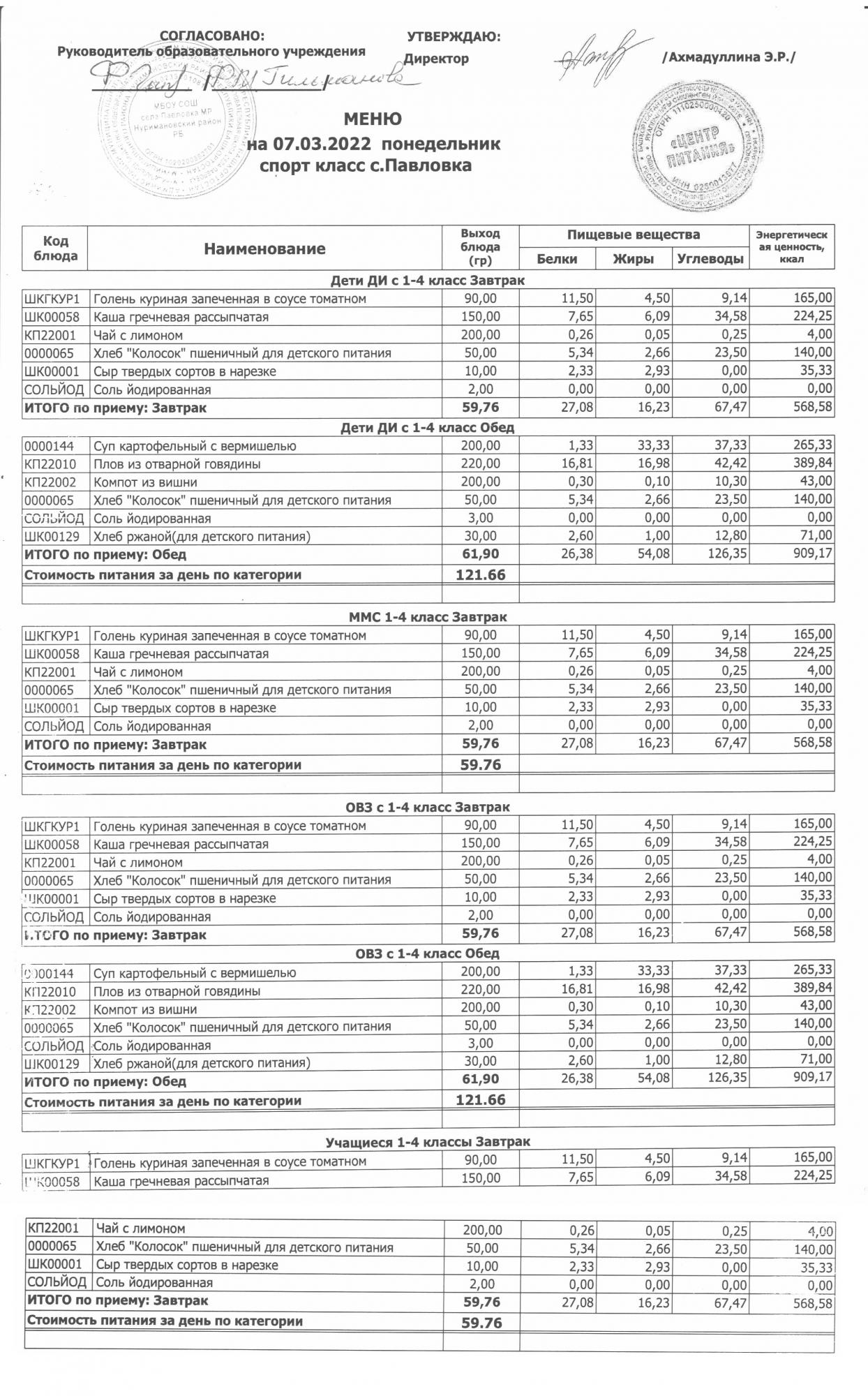 (меню на 07.03.2022 в начальной школе)