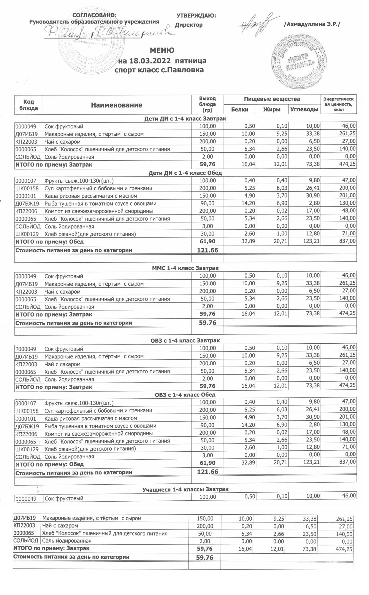 (меню на 18.03.2022г. в начальной школе)