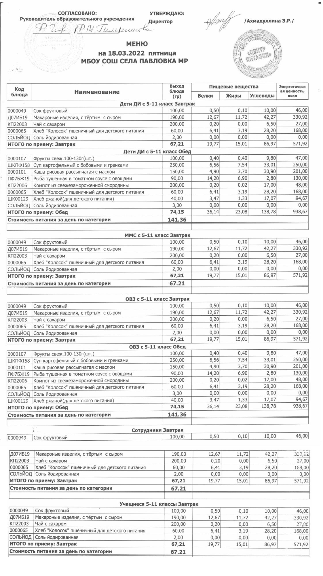 (меню на 18.03.2022г. в основной школе)