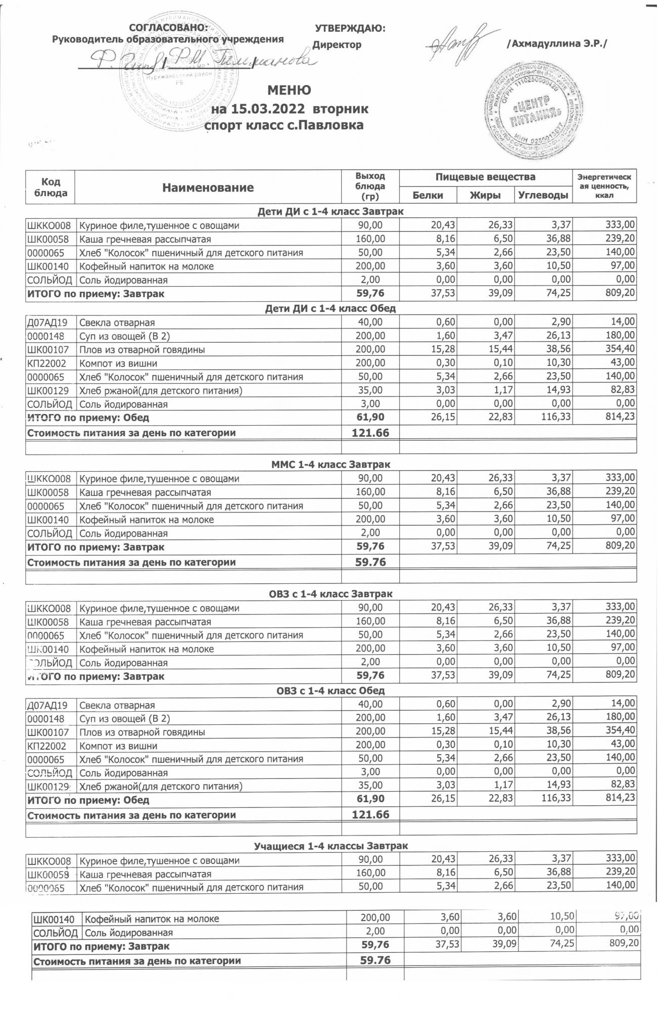 (меню на 15.03.2022г. в начальной школе)