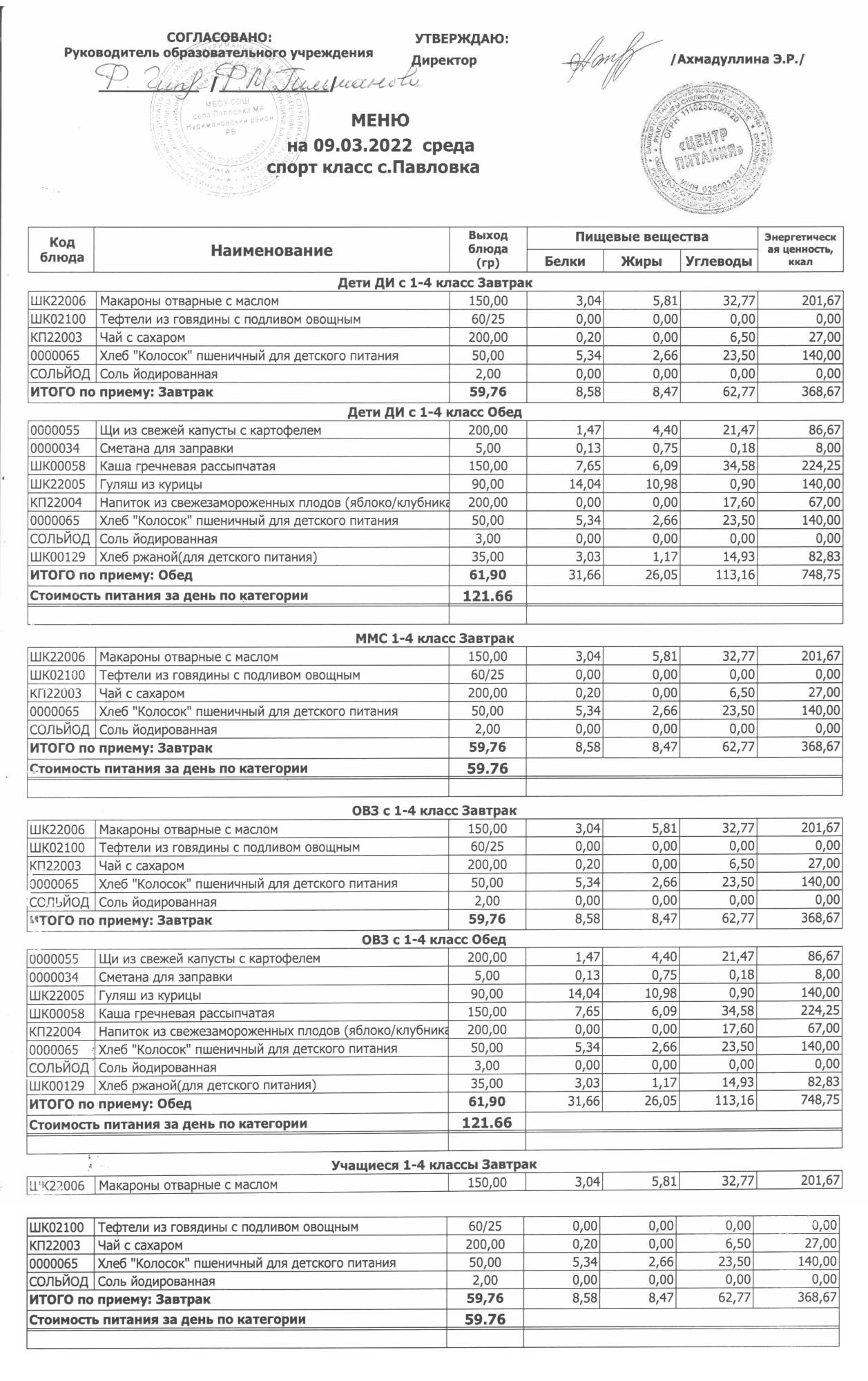 (меню на 09.03.2022 в начальной школе)