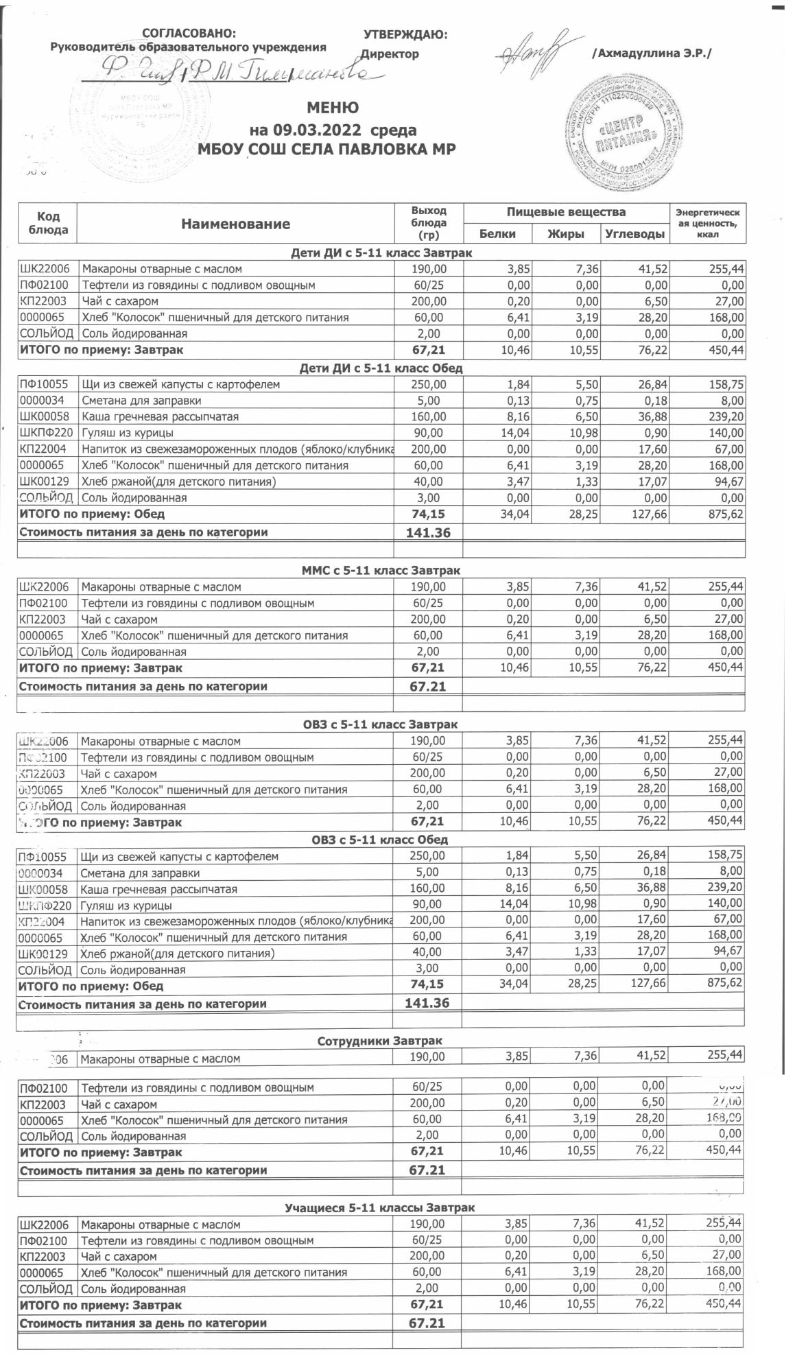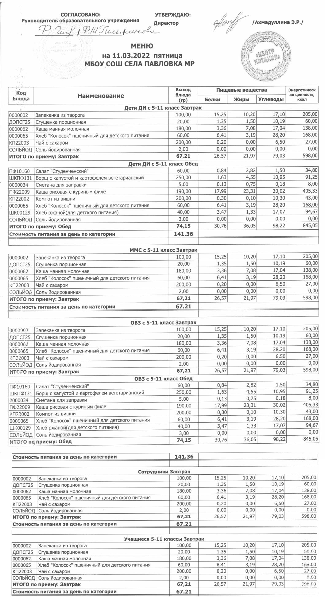 (меню на 11.03.2022г. в основной школе)