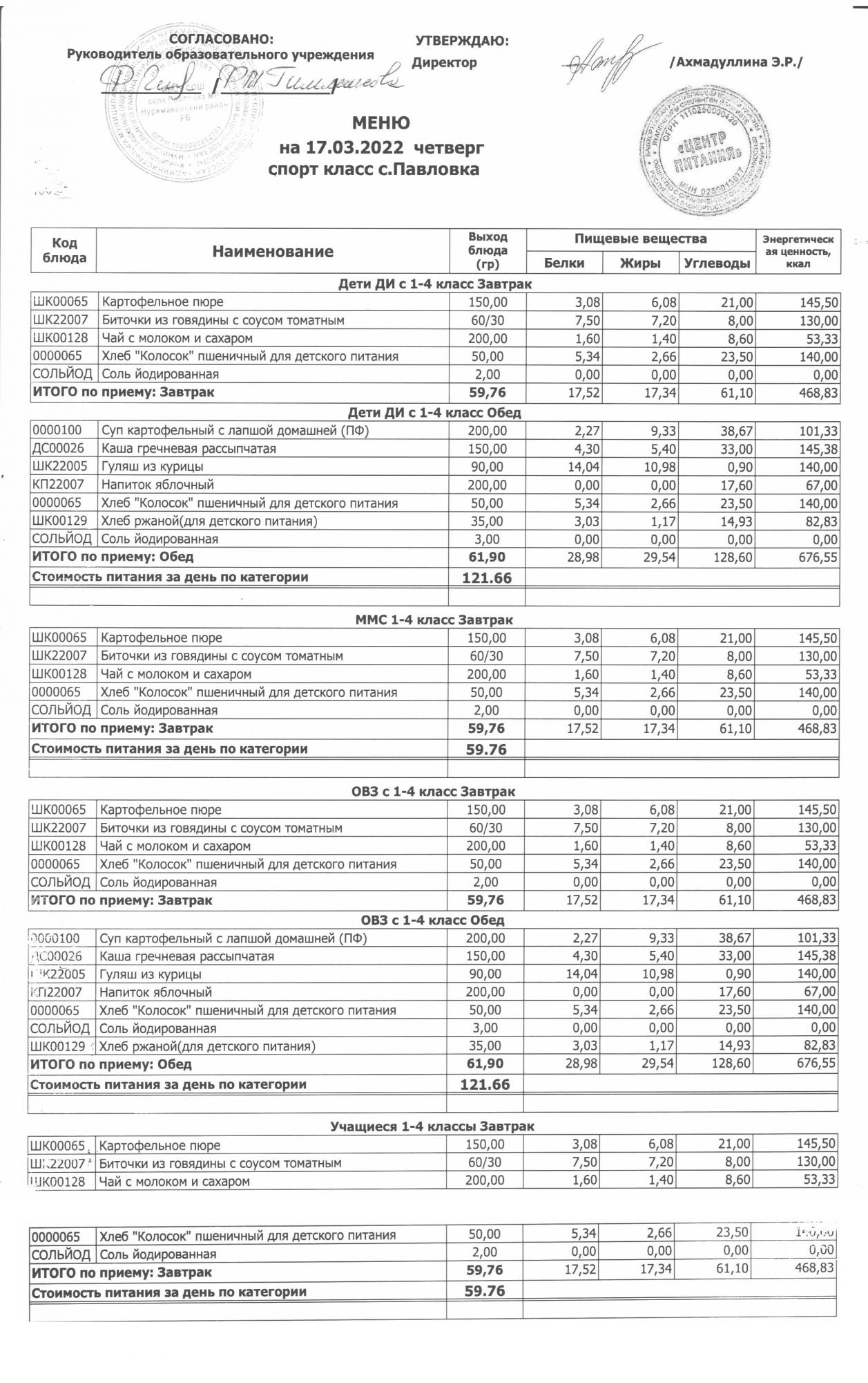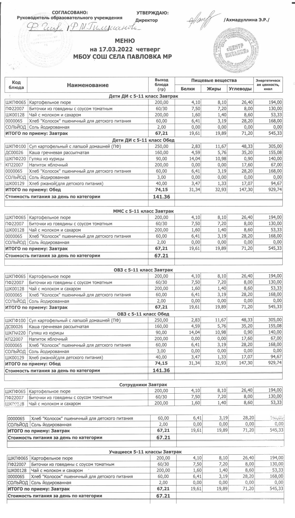 (меню на 17.03.2022г. в основной школе)