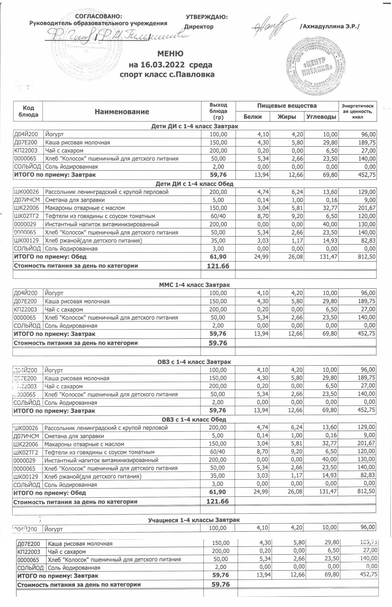(меню на 16.03.2022г. в начальной школе)