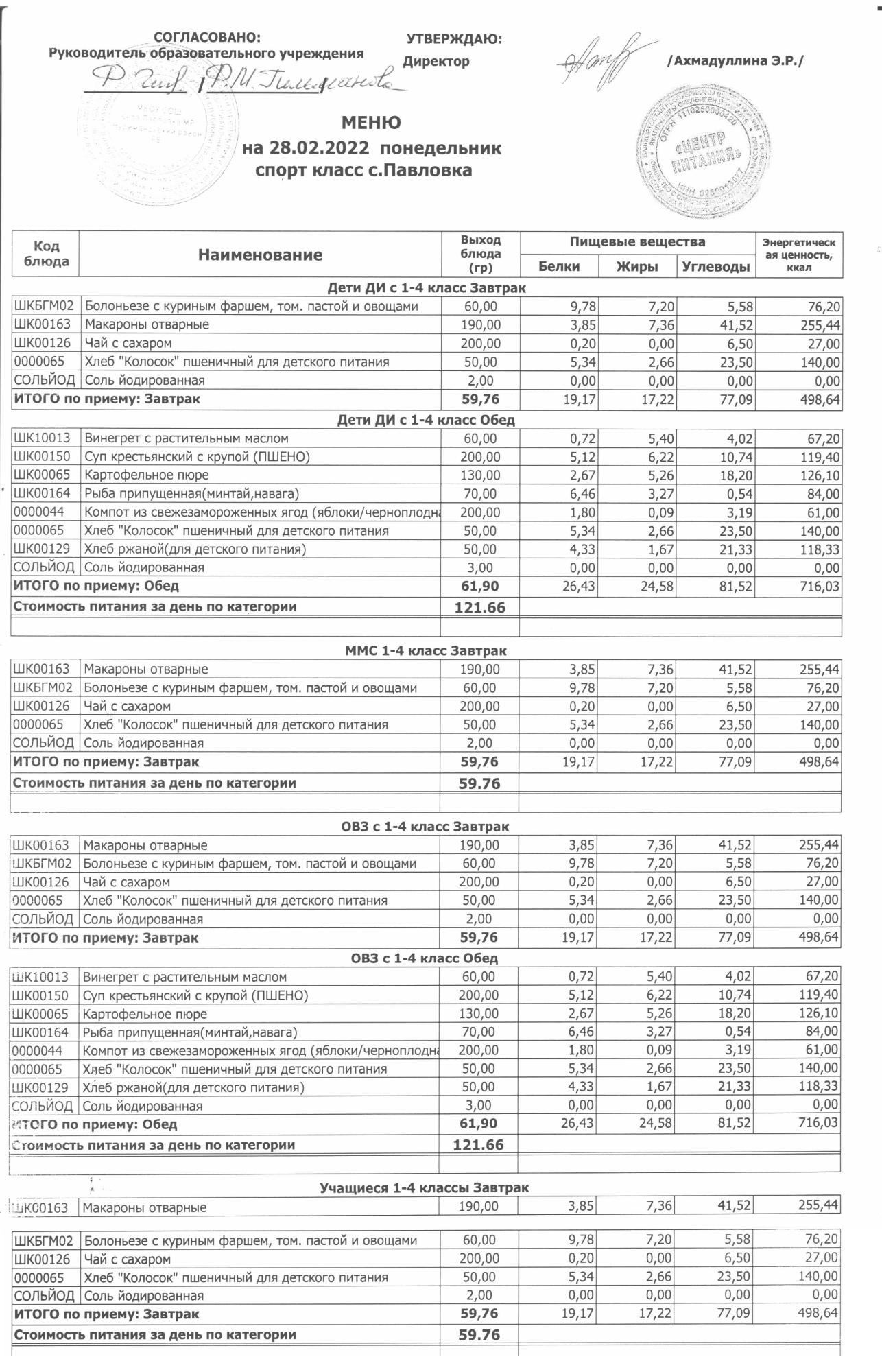 (меню на 28.02.2022 г. в начальной школе)