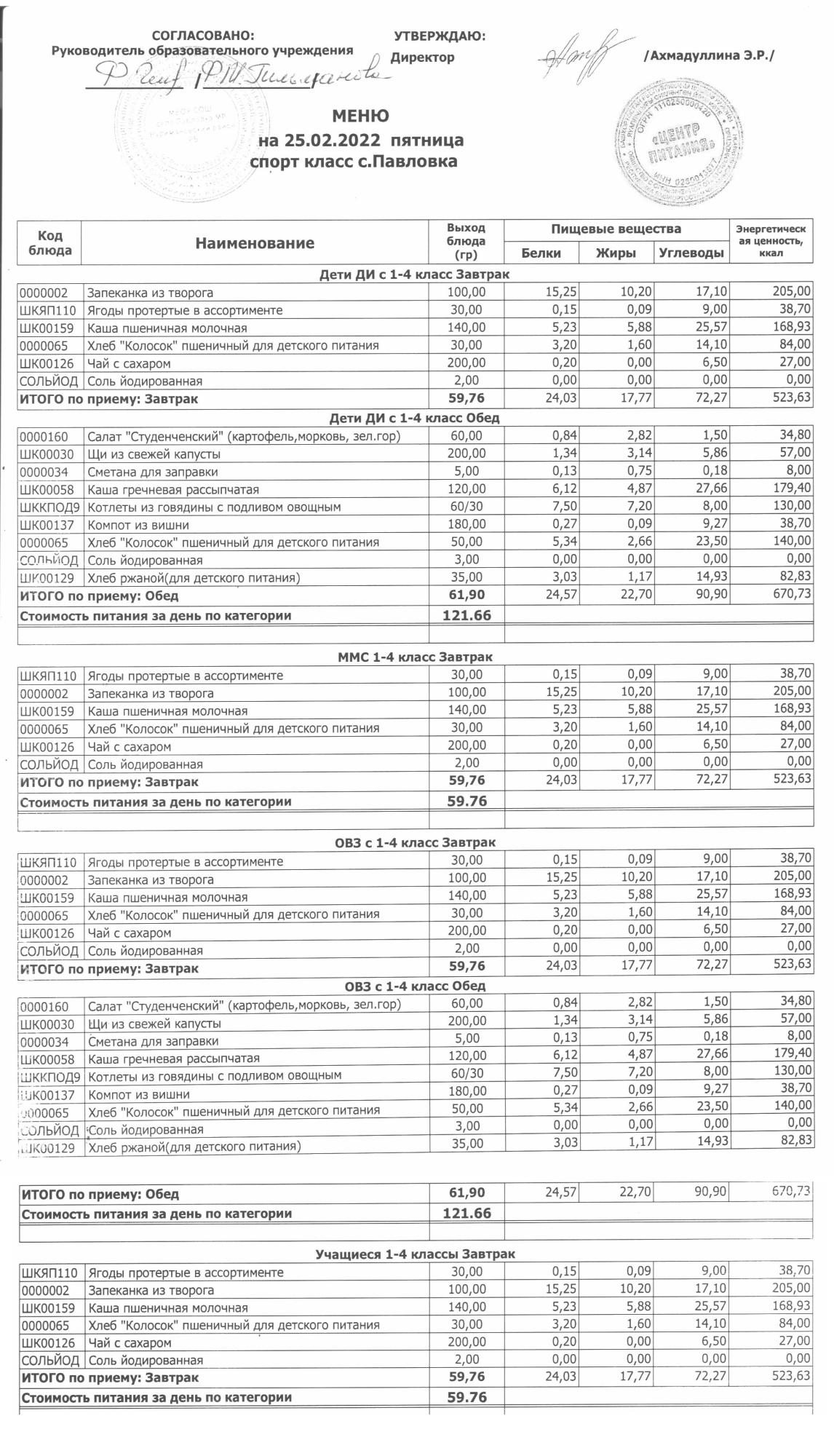 (меню на 25.02.2022 г. в начальной школе)
