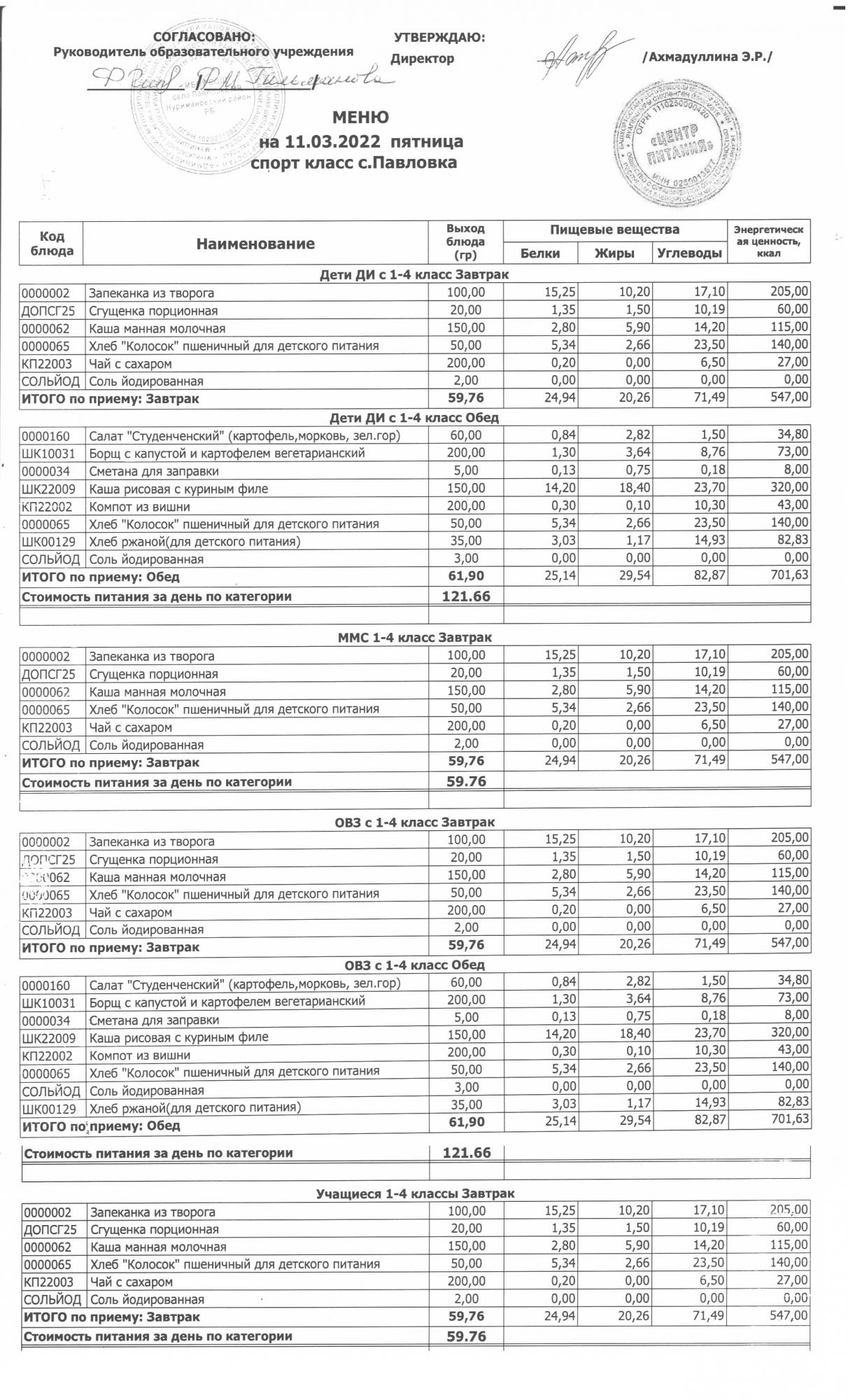 (меню на 11.03.2022г. в начальной школе)