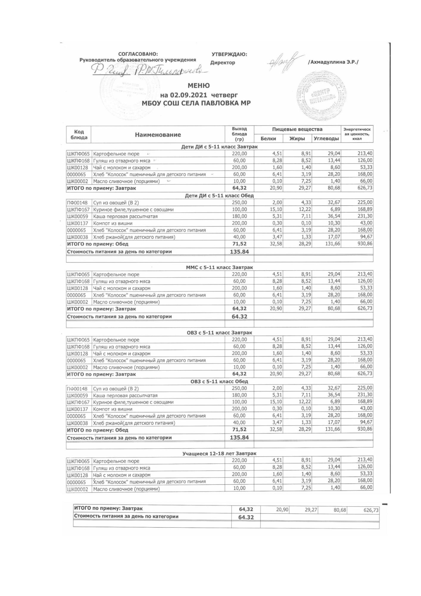 (меню на 02.09.2021 в основной школе)