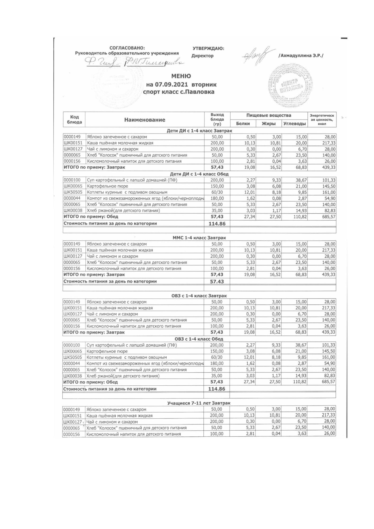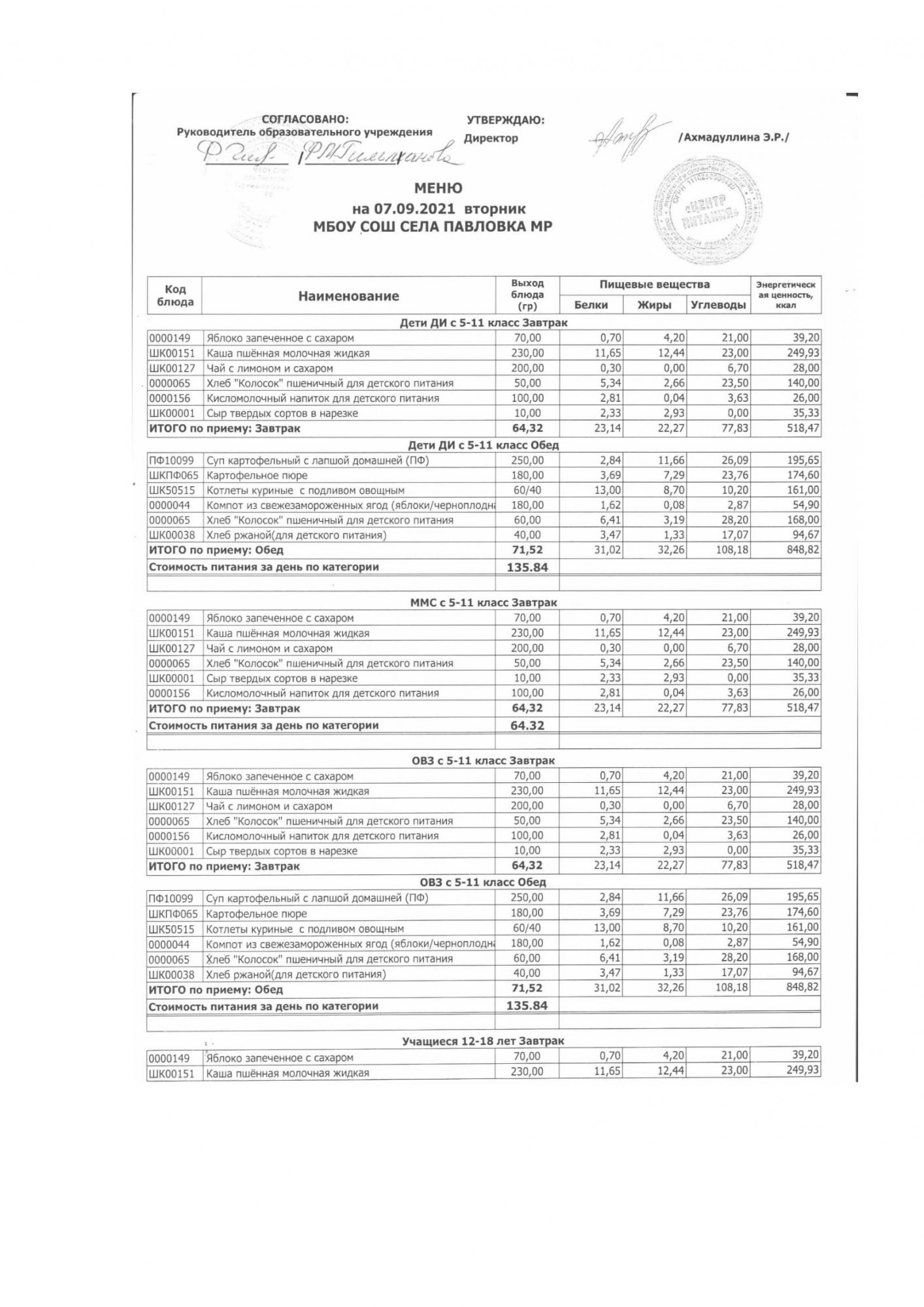 (меню на 07.09.2021 в основной школе)