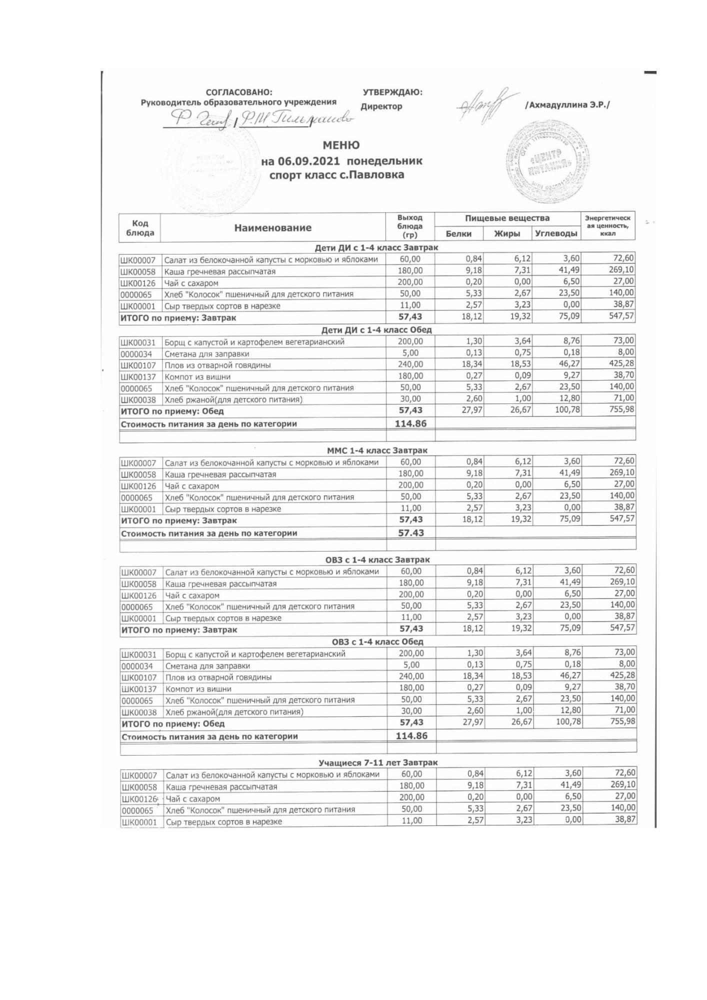 (меню на 06.09.2021г.в начальной школе)