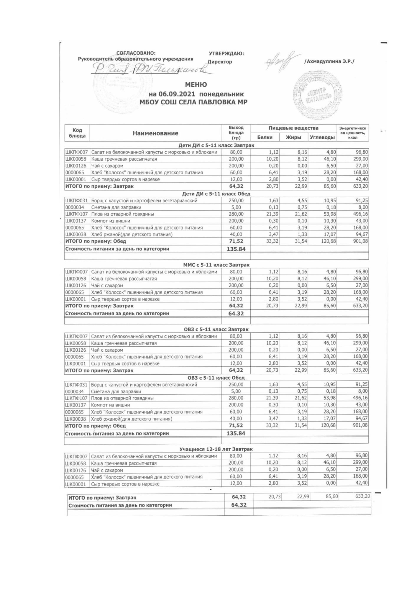 (меню на 06.09.2021г. в основной школе)