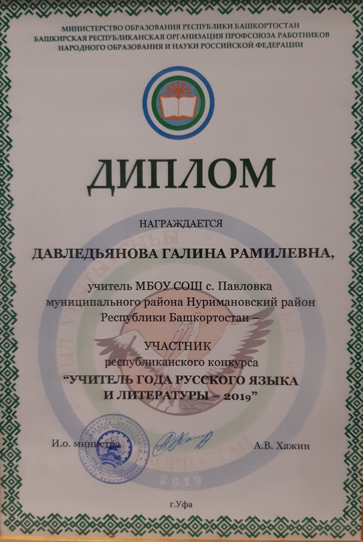 Профессиональные конкурсы объединили педагогов городов Республики и соседних регионов. На протяжении целого месяца мы волновались, болели и радовались успехам Давледьяновой Галины Рамилевны, учителя русского языка и литературы МБОУ СОШ с. Павловка, защищающей честь нашего района и нашей школы на Республиканском конкурсе «Учитель года русского языка и литературы-2019».