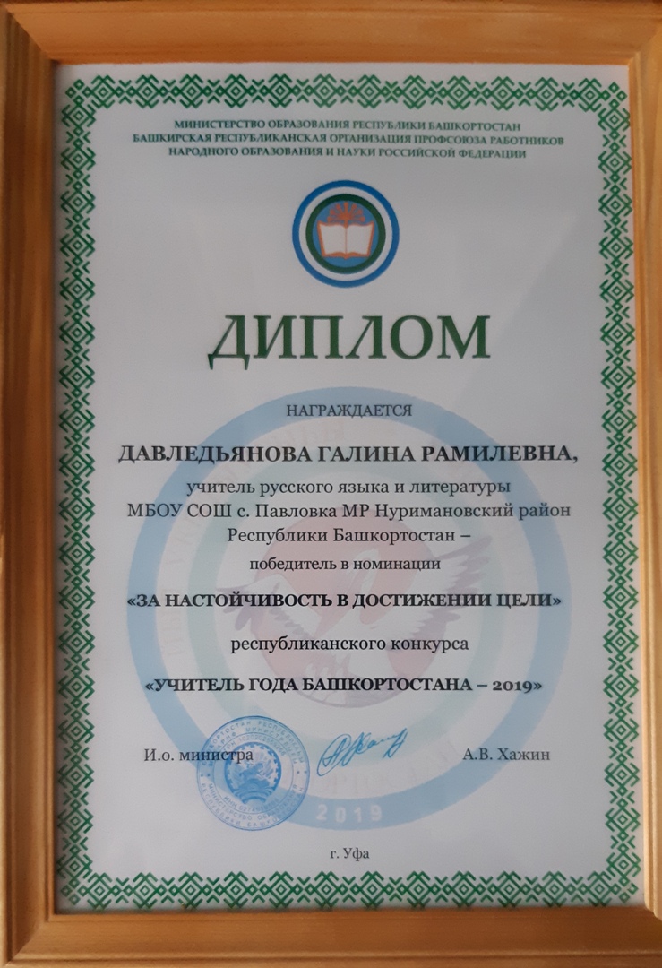 В номинации «За настойчивость в достижении цели» победителем стала Давледьянова Галина Рамилевна, учитель русского языка и литературы средней общеобразовательной школы села Павловка МР Нуримановский р-н.